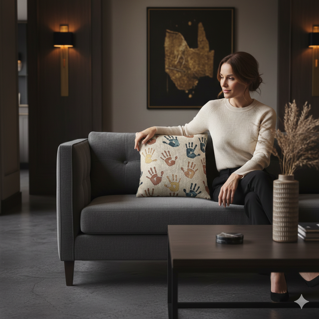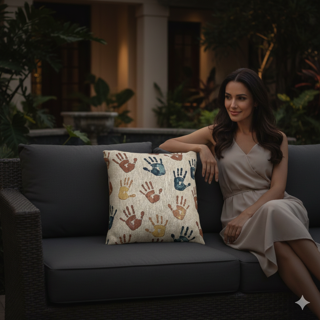 This woven pillow brings quiet, handcrafted warmth to a reading nook or living room. Woven threads create a subtle textured backdrop for playful handprint motifs in muted indigo, rust, and ochre. The slightly distressed, artisan look reads like an heirloom textile — comfortable, lived-in, and layered with personality. It sits well on a wicker chair, layered with a chunky throw, or tucked into a cozy window seat where afternoons are spent with tea and paperbacks. Choose the Artwork variant for crisp, graphic handprints or the Photo variant if your design needs softer color transitions. The print repeats on both sides so the pattern shows from every angle. Product features - 58% cotton / 42% polyester woven face — strong, smooth fabric that holds print detail - 100% polyester filling — resilient, quick-drying, holds shape - One size: 17" × 18" (43.2 × 45.7 cm); design duplicated on both sides - Artwork or Photo variants available — pick Artwork for bold blocks, Photo for subtle gradations - Made with woven polyester fabric (France) and zipper (Belgium); mockups may differ from final piece Care instructions - Spot Clean / Dry Clean Only