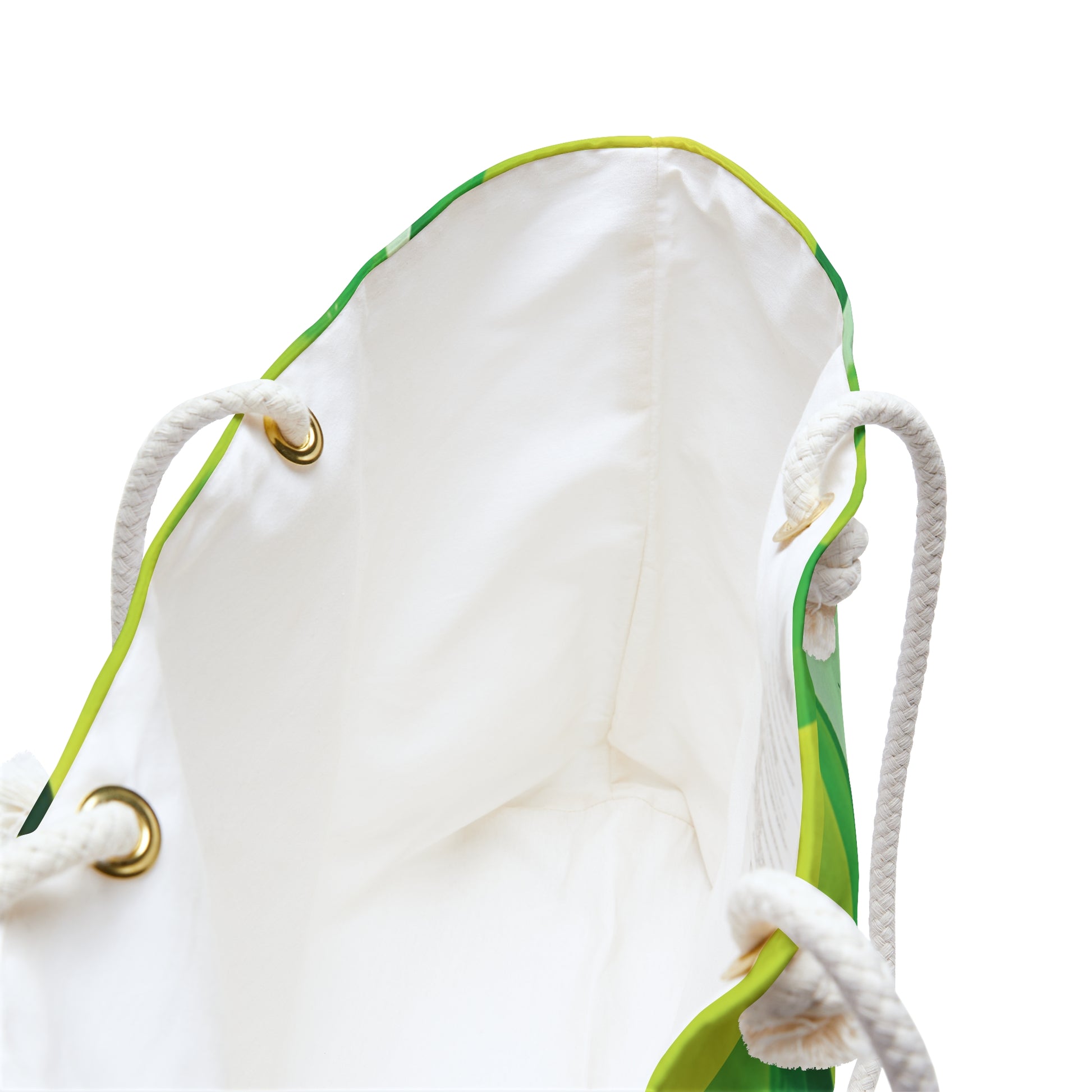 A lively, roomy companion that brings a splash of summer to every outing. This oversized bag carries beach towels, market finds, or weekend clothes with cheerful ease. The vivid kiwi-inspired print wraps the whole exterior in bright chartreuse and emerald swirls, while cream rope handles and gold-tone grommets add tactile contrast you’ll reach for again and again. The T-bottom gives structure for packing, and the soft cream interior keeps contents gently cradled. Lightweight but sturdy, it slips into the flow of a sunny morning: farmers’ market runs, ferry commutes, or a spontaneous overnight escape. Product features - Durable 100% spun polyester exterior resists wrinkles and keeps the print vibrant - Cream cotton rope handles (27") threaded through gold-color metal grommets - Spacious one-size (24" x 13") with T-bottom for stable packing - Cream sheeting interior lining (50% cotton, 50% polyester) for a soft inside - Assembled in the USA from globally sourced parts; size tolerance ±0.75" Care instructions - Before cleaning the bag, remove all the items from the bag. Suggested to pretreat visible stains with stain remover. Mix warm water with laundry detergent and clean the bag with terry washcloth or soft bristle brush. Let the bag air dry.