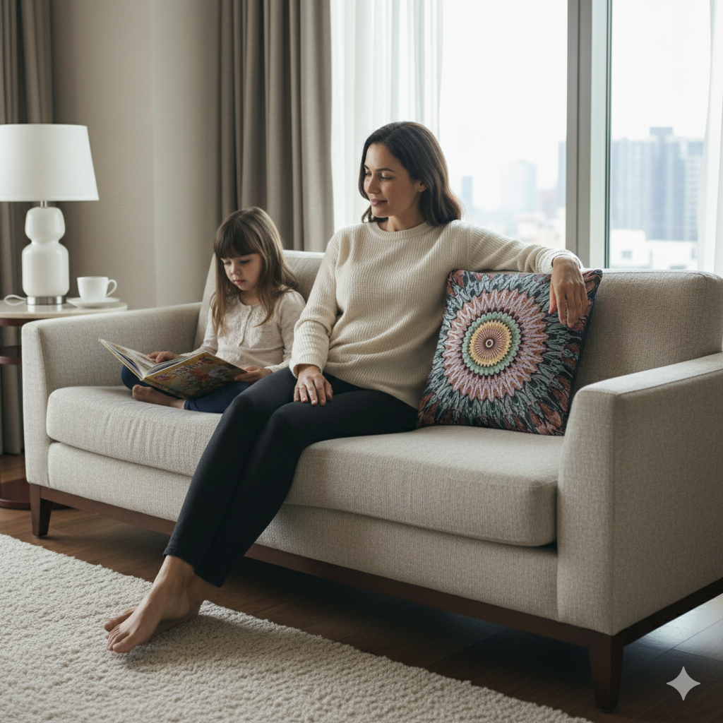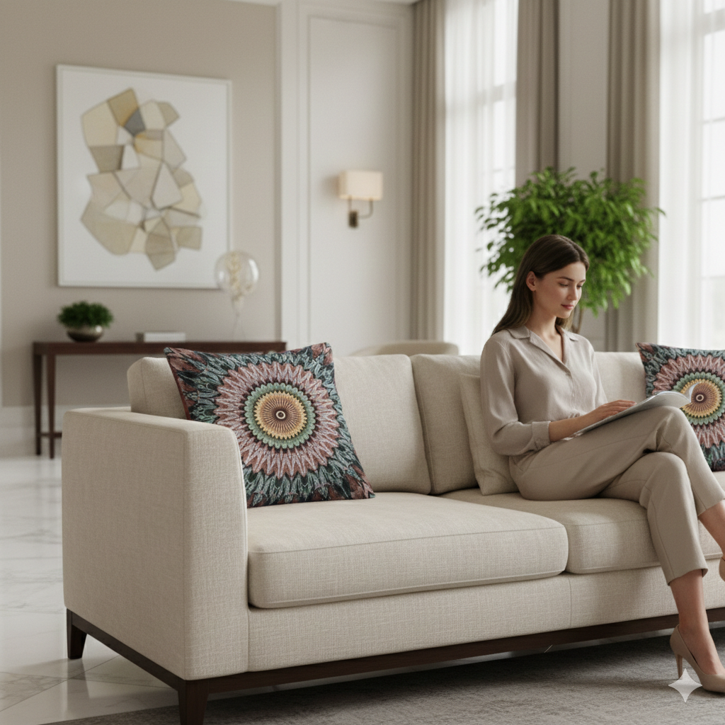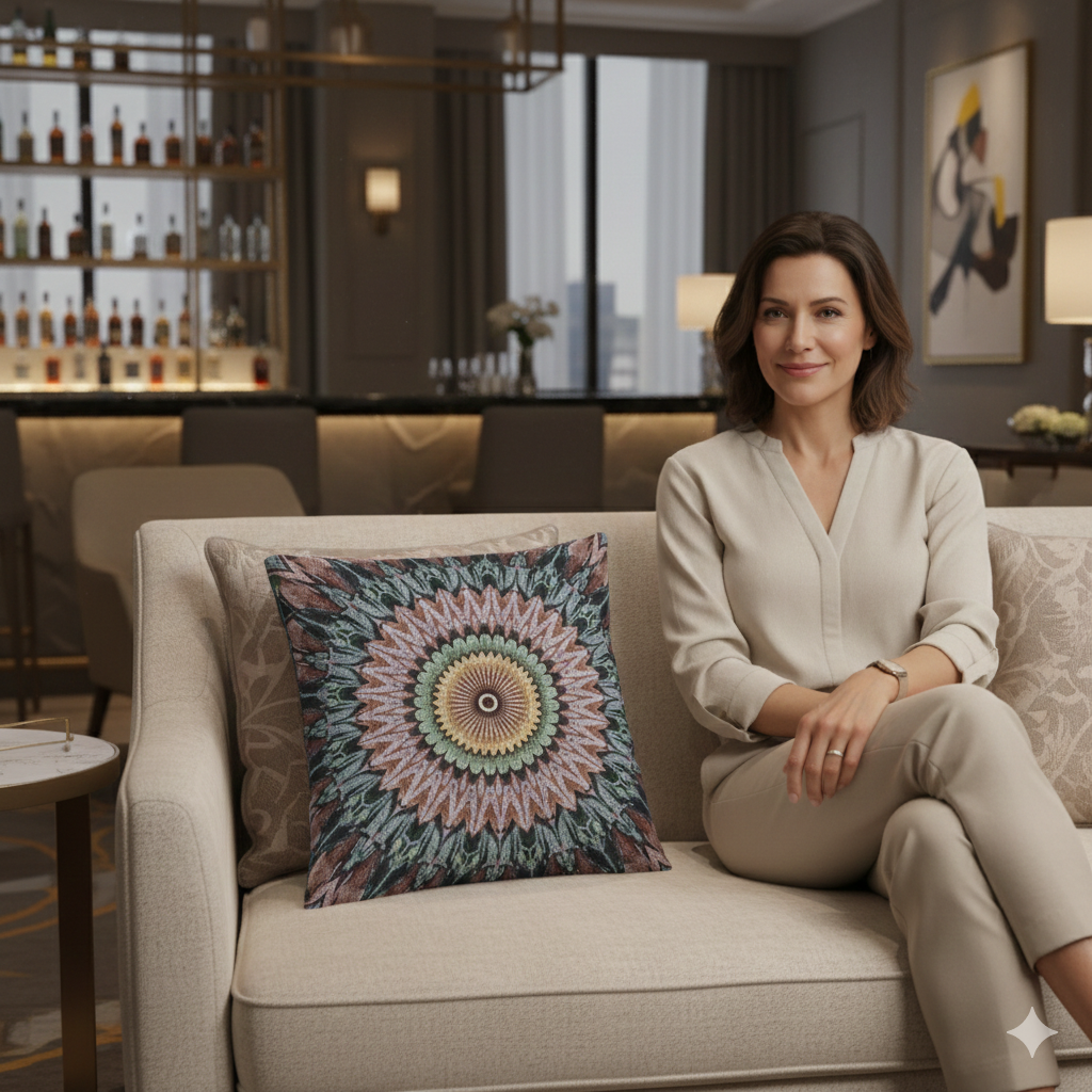 A tactile, woven pillow that reads like a hand-stitched mandala. The dense, geometric pattern centers on a sunburst medallion in warm terracotta and ochre, balanced by cool teal and slate accents. Because the design is woven into the fabric, the texture becomes part of the image — you can feel the radial layers as much as see them. This pillow brings a grounded, artisanal touch to a living room, reading nook, or bedroom, blending earthy tones with an intricate, crafted look. The double-sided repeat keeps the motif visible from every angle, and the resilient polyester-cotton weave holds crisp edges for bold, separated designs. Choose the Artwork variant for the punchy color blocks shown, or Photo for more nuanced gradients when needed. Sized at 17" × 18", with a durable polyester fill, it keeps shape and recovers quickly after use. Product features - 58% cotton / 42% polyester woven face for strong, smooth print clarity - Durable 100% polyester filling that retains shape and dries fast - Design duplicated on both sides; best results with Artwork variant for bold blocks - One size: 17" × 18" (43.2 × 45.7 cm); woven threads create subtle tactile texture - Made with woven polyester fabrics (France) and zipper from Belgium; adult use Care instructions - Spot Clean / Dry Clean Only