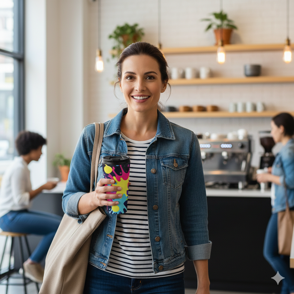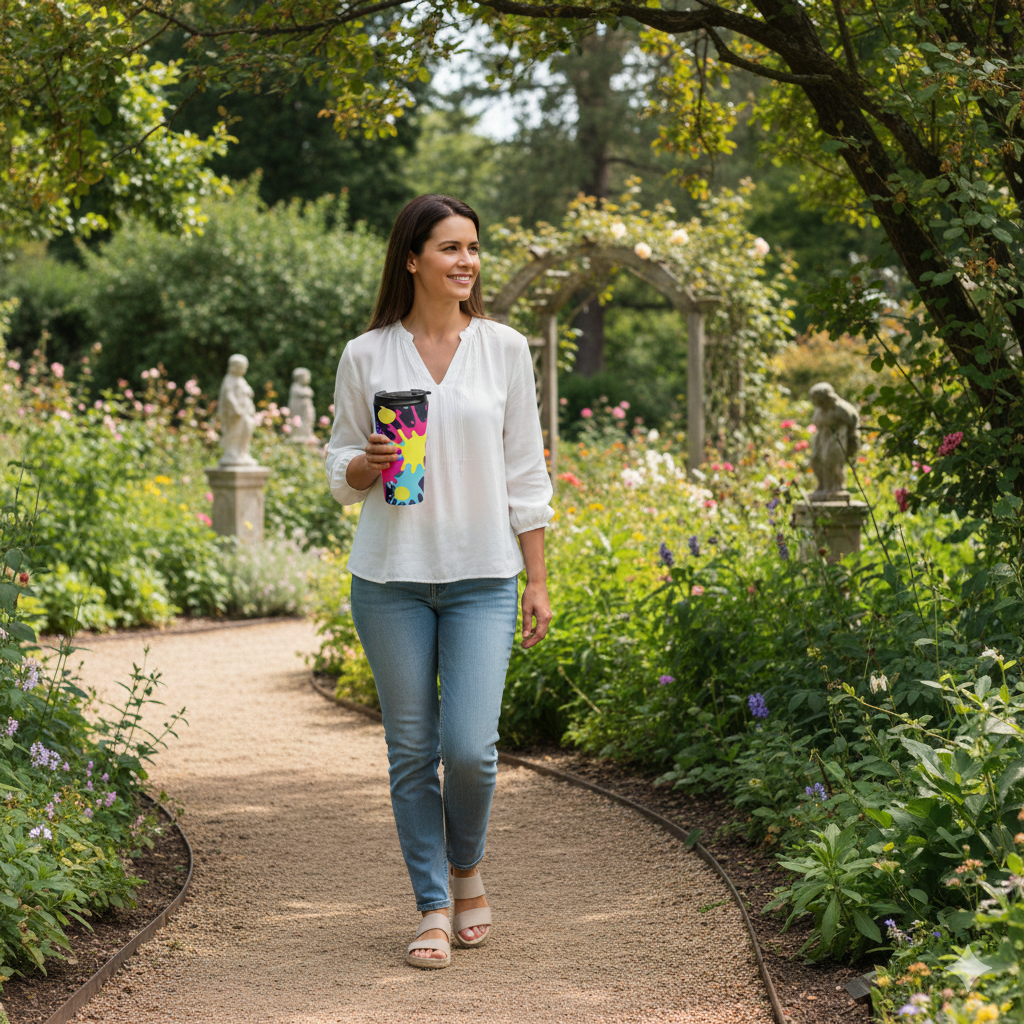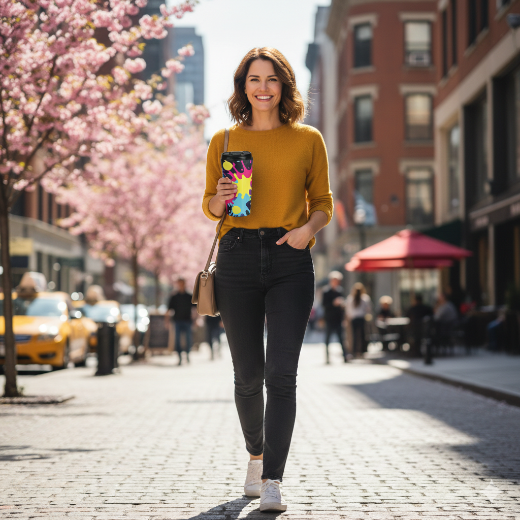 Bright, splashy energy wrapped in stainless steel. This 15oz travel mug keeps your drink secure and steady while you move—its vacuum-insulated body holds temperature, while the BPA-free flip-top lid locks in every pour without leaks. The design speaks in neon paint splatters and bold contrasts, a playful burst that lifts your morning commute or studio session. It feels like a shout of color against gray days, easy to grip with rounded edges and simple to clean when the day is done. Bring it to art classes, road trips, or long shifts—its durable build and dishwasher-safe finish handle life’s messes so you don’t have to worry.