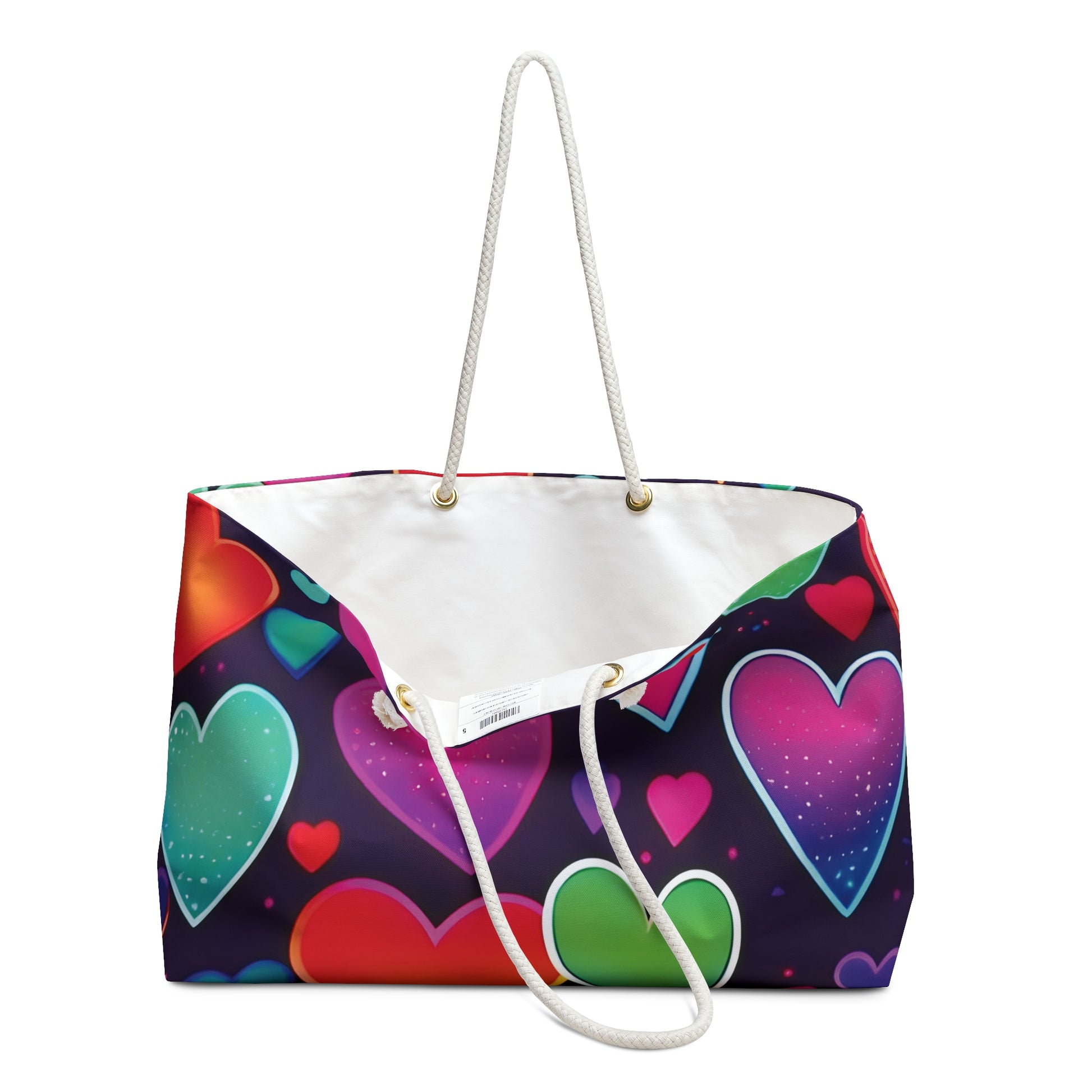 Bright, roomy, and playful — this weekender carries a burst of color with oversized neon hearts against a deep, moody background. The roomy T-bottom silhouette holds clothes, toiletries, and weekend extras without fuss. Soft cream rope handles sit comfortably on the shoulder and add a breezy, beach-to-city vibe. The spun polyester exterior resists wrinkles so the print stays vivid and fresh, while the cream sheeting interior keeps smaller items protected and easy to find. Whether it's a quick coastal escape or a spontaneous overnight with friends, this bag brings joy in every fold and feels lively the moment you pick it up. Product features - Durable 100% spun polyester exterior that resists wrinkles and keeps prints vibrant - 27" cream cotton rope handles threaded through gold-color metal grommets for a nautical look - Spacious one-size dimensions: 24" x 13" with a T-bottom for extra packing room - Cream 50/50 cotton-poly interior lining for a soft, protective inside finish - Assembled in the USA from globally sourced parts; size tolerance ±0.75" Care instructions - Before cleaning the bag, remove all the items from the bag. Suggested to pretreat visible stains with stain remover. Mix warm water with laundry detergent and clean the bag with terry washcloth or soft bristle brush. Let the bag air dry.