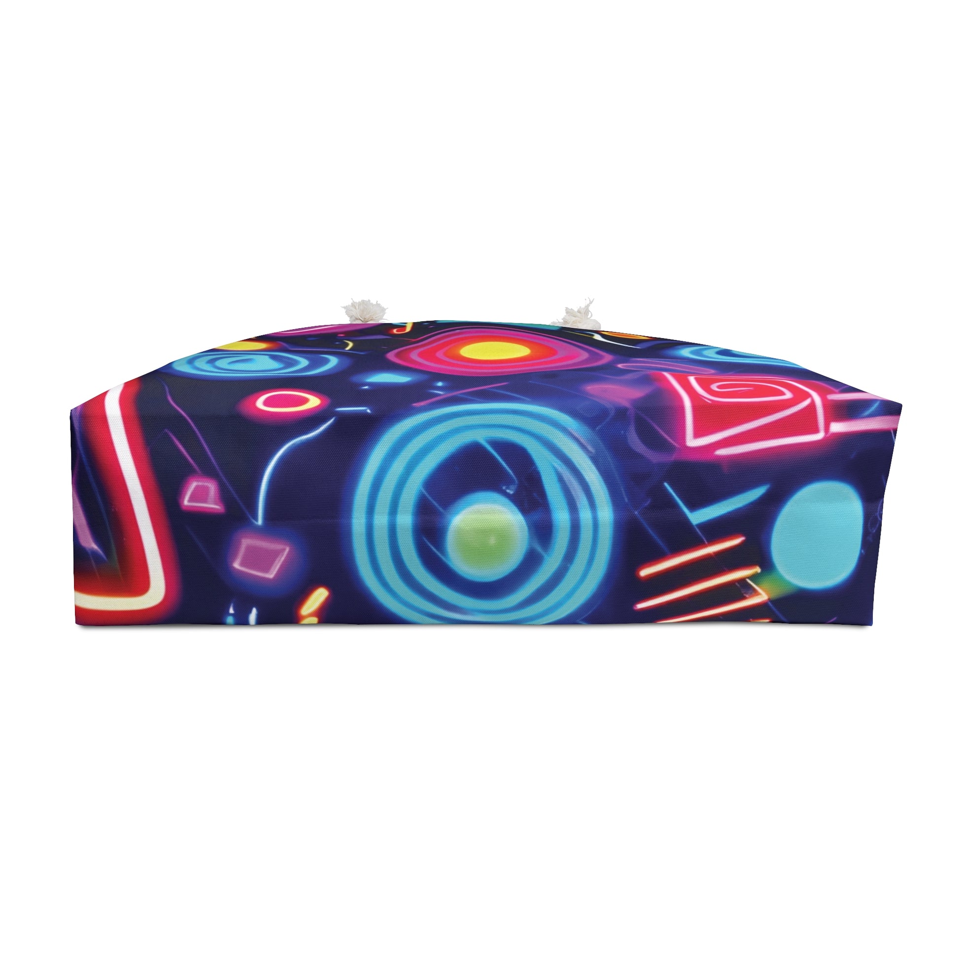 A vibrant, roomy weekender bag that brings neon-night energy to every trip. The oil-slick background sets off electric swirls and geometric neon shapes in hot pinks, blues, and citrus—like a city skyline reflected on rain-slick pavement. The roomy 24" x 13" T-bottom holds clothes, a laptop, and toiletries without sagging. Cream rope handles and gold-tone grommets add tactile warmth and a little maritime flair. Inside, a soft cream sheeting lining keeps contents tidy and contrasts with the bold exterior. Built from wrinkle-resistant spun polyester, it travels light, resists creases, and looks fresh straight from the trunk. Assembled in the USA from globally sourced parts, this bag feels like your go-to companion for a spontaneous getaway or a long weekend of city-hopping. Product features - Roomy 24" x 13" T-bottom holds clothes and extras - Wrinkle-resistant 100% spun polyester exterior - 27" cream cotton rope handles with gold-color grommets - Soft cream 50/50 cotton-poly interior lining - Assembled in USA; size tolerance ±0.75" Care instructions - Before cleaning the bag, remove all the items from the bag. Suggested to pretreat visible stains with stain remover. Mix warm water with laundry detergent and clean the bag with terry washcloth or soft bristle brush. Let the bag air dry