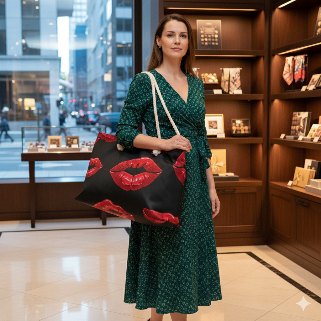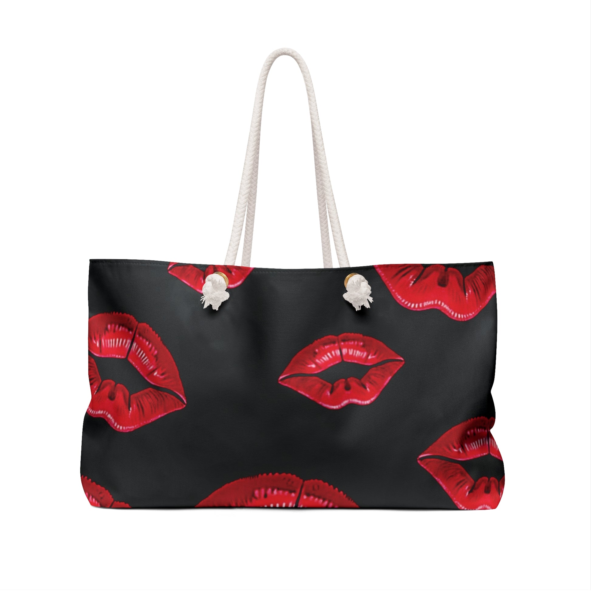 A bold, carry-anywhere weekender that speaks in scarlet. Smooth spun polyester holds a repeat of glossy red lips against a deep charcoal ground — a little flirt, a little attitude. The roomy T-bottom silhouette swallows a weekend’s worth of outfits and toiletries while cream rope handles sit comfortably over the shoulder. Inside, a soft cream cotton-poly lining keeps smaller items tucked and protected. It travels easily, resists wrinkles, and arrives assembled in the USA from thoughtfully sourced parts. Bring it to quick trips, nightlife getaways, or days when you want your bag to do the talking. Product features - Durable 100% spun polyester exterior resists wrinkles and holds vibrant print - 27" cream cotton rope handles threaded through gold-tone metal grommets - Spacious one-size T-bottom design (24" x 13") for weekend packing - Cream 50/50 cotton-poly interior lining for gentle protection of contents - Assembled in the USA from globally sourced parts; size tolerance ±0.75" Care instructions - Before cleaning the bag, remove all the items from the bag. Suggested to pretreat visible stains with stain remover. Mix warm water with laundry detergent and clean the bag with terry washcloth or soft bristle brush. Let the bag air dry.