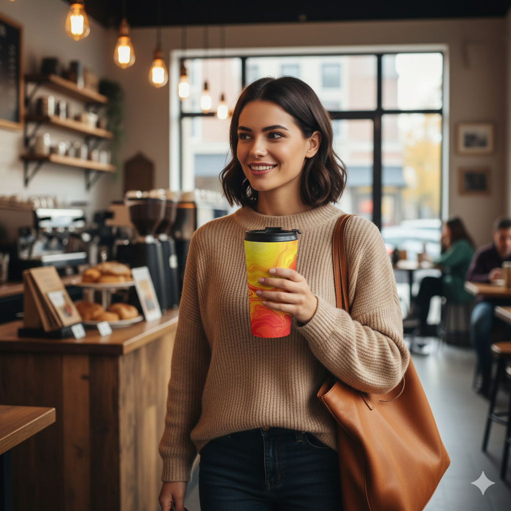 Bright, swirling color that feels like holding sunrise in your hands. This 15oz stainless steel travel mug keeps drinks hot or cold while you navigate mornings, studio sessions, or long commutes. The leak-resistant screw-on lid with a flip top gives confident sips on the go. Smooth rounded corners and a vivid marbled print add playful energy to your routine — a small, reliable companion that stands up to daily use and dishwashing without losing its shine.